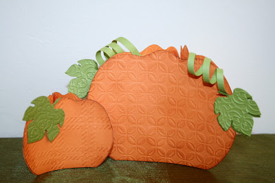 Emboss the pumpkins and leaves with embossing folders and ink the edges with brown ink.
